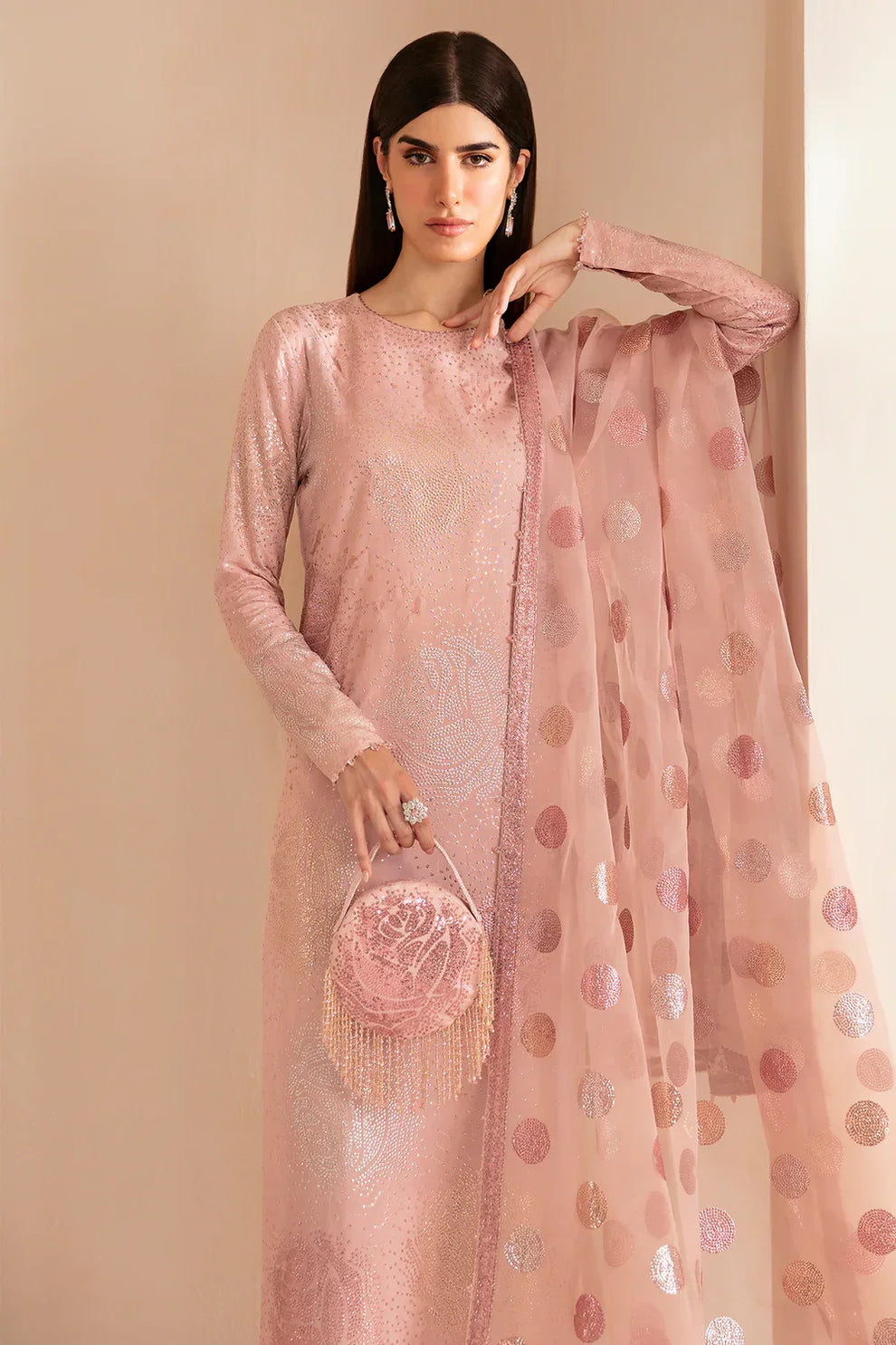 Radiate sophistication with Jazmín’s D#90016, a breathtaking pastel pink ensemble crafted from premium Shamos Silk. This outfit exudes grace with its double sequins embroidery that catches the light beautifully, creating a luxurious shimmer effect. The matching organza dupatta, detailed with delicate embroidery and sequins, enhances its ethereal charm — perfect for festive occasions, formal gatherings, or elegant evening events.